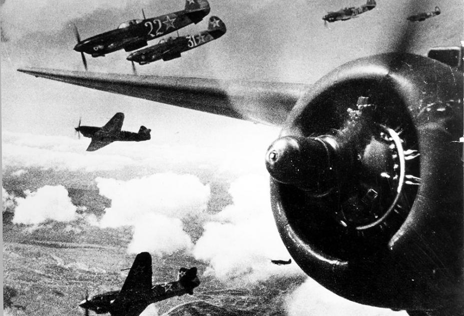 Четырнадцать вражеских истребителей напали на двух наших ястребков. Краснозвездные самолеты молниями сверкали в этой черной, вражьей туче. Своим мастерством и отвагой они побеждали смерть. Враги нападали на них и в лоб, и сверху, и снизу. Но и в таком положении наши храбрецы помогали друг другу.
